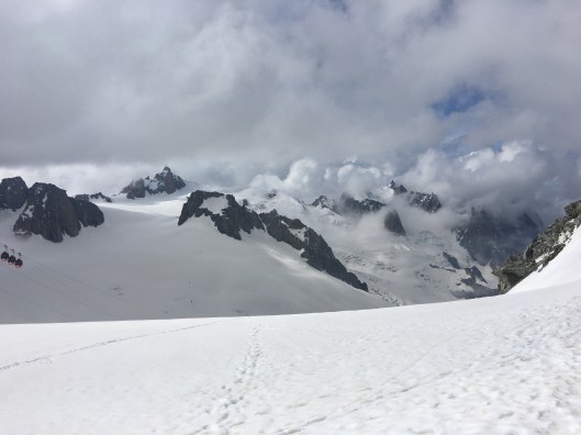 Once we had calmed down a bit, David gave us a panoramic calling out the names of all the significant peaks below, including the Matterhorn and Gran Paradiso. The Aiguille du Midi which towers over Chamonix was a tiny spike far below us, as was the plane that flew by. David even showed us Lake Geneva many miles away in Switzerland.