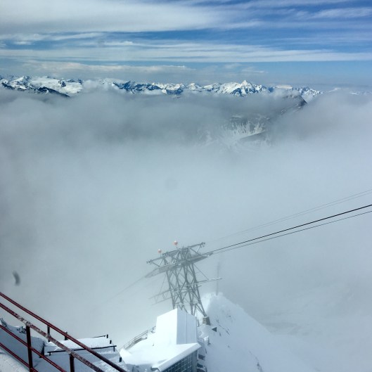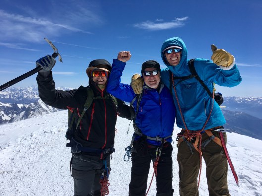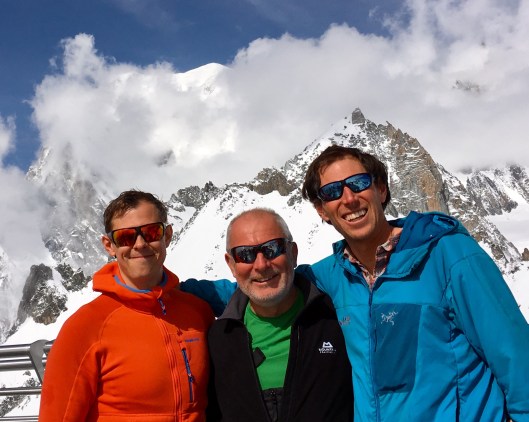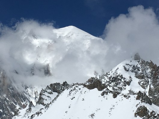 As we approached we could see the group we had had in our sights. They were whooping and cheering and then we were with them. It was midday exactly, around 30 minutes sooner than David’s estimate when we left the Tête Rousse 7 hours earlier. There was a wonderfully spontaneous upwelling of emotion as we stepped onto the highest point in Europe. Ok, Western Europe if you insist, but we were there high fiving, handshaking and back slapping. The emotion became too much and I grabbed Stephen’s jacket at his chest with both gloved hands and buried my sobbing face into it. Just for a few seconds then everything was ok again. Extraordinary.