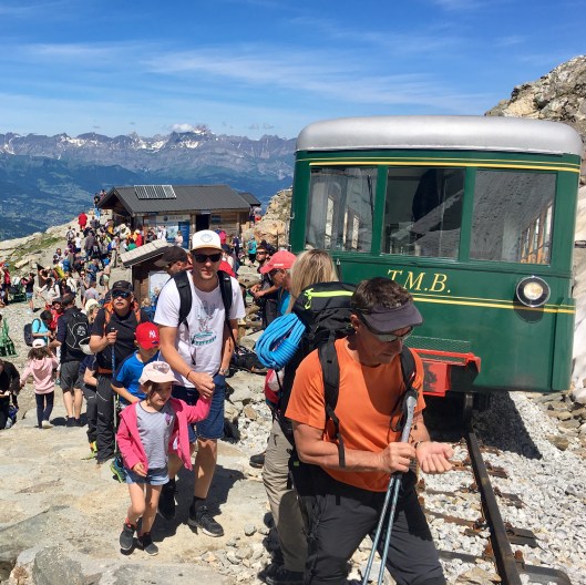 With this behind us there were no more objective dangers and our job was done. We didn’t stop at the Tête Rousse Hut instead preferring to head down to the Chamonix valley by the fastest route. This was glissading (bum sliding) down the snow and icefields almost all the way down to the Mont Blanc train station. What had taken 2 hours to climb on Sunday took about 20 minutes. Thereafter we took the train to Bellevue and the cable car down to Les Houches.
