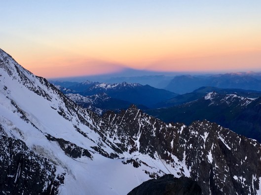 Guidebooks advise the Grand Couloir should be crossed extremely carefully and as quickly as possible. While there was plenty of evidence of recent rockfall in the couloir we crossed without incident. Our departure from Tête Rousse had been timed to arrive here in daylight, while the snow was still solidly frozen. This reduced the risk of being struck unawares. In passing we were treated to a view to the west which featured the shadow of Mont Blanc.