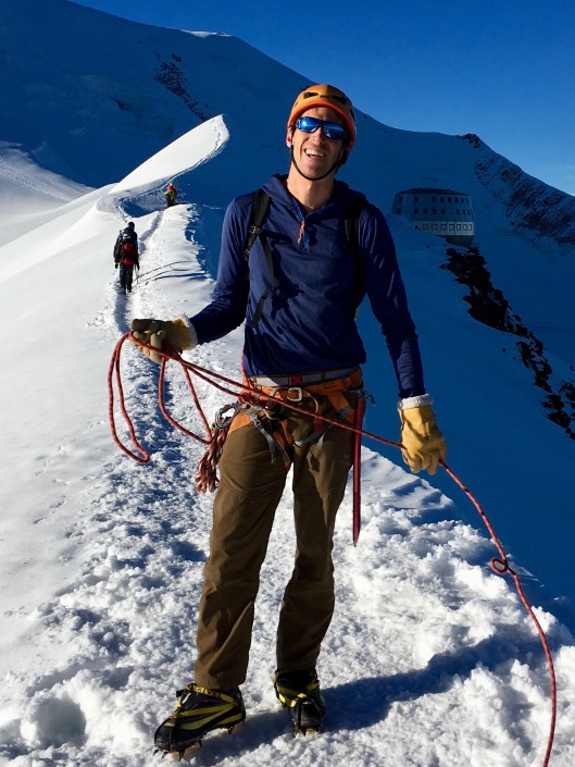 After a bite to eat and drink we set off up the big hill at about 7:30. The ever-vigilant David checked our gear and estimated arrival at the summit around 12:30. Here he is on the snowy crest of the Aiguille de Goûter getting ready to get us roped up for the journey ahead. The amazing space capsule-like new Goûter refuge may be seen in shadow just over his right shoulder.