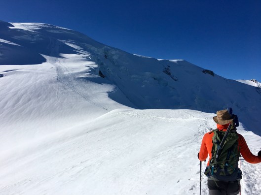 The slope up to the summit of the Dôme de Goûter gradually increased but our route made this a little easier by following the zig zag path already trodden by others and which avoided the crevasses. It wasn’t necessary to crest the Dôme; instead having caught up with another group we followed the trodden path to its left towards the Col du Dôme.
