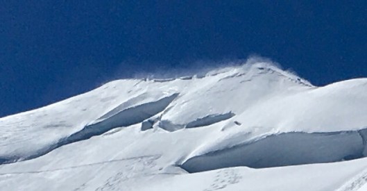 Beyond where the team of 6 were and up a significant rise is the Abri Vallot shelter. This isn’t manned but, at 4300m, it provides a simple shelter for those who need it. We stopped for some food and drink here. Not for long, but long enough to fuel up as the going ahead was daunting. More to the point we could see from here that while the mountain was bathed in warm golden sunshine there was a significant wind blowing higher up. From our vantage point we could see the Bosses Ridge and beyond it the awesome summit ridge. All the way, and particularly along the summit ridge, a strong wind from the left was blowing plumes of snow and ice over and beyond the cornices that line the route from now to the summit. Here is a close up of the summit ridge showing the plumes.