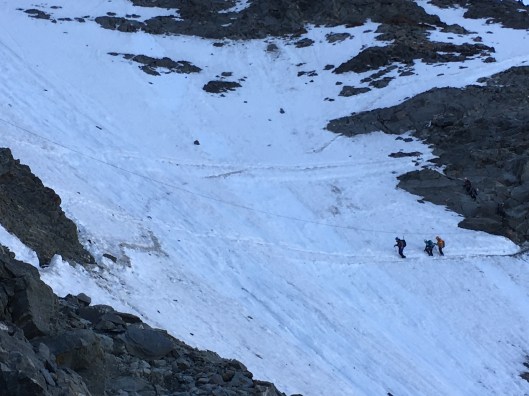 This meant crossing the dreaded Grand Couloir for the second time. There was evidence of recent rockfall and I took this photo of a following group, but nothing befell us.