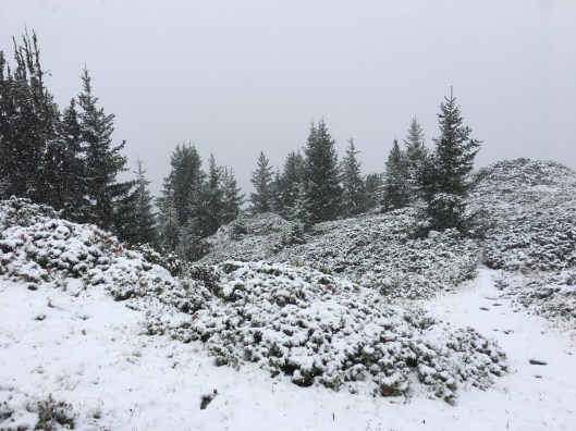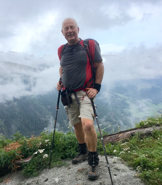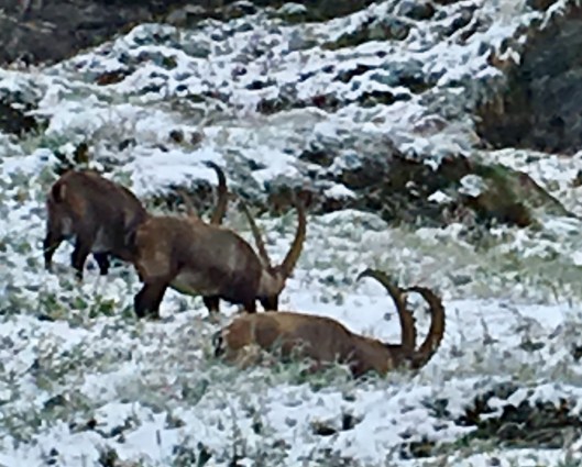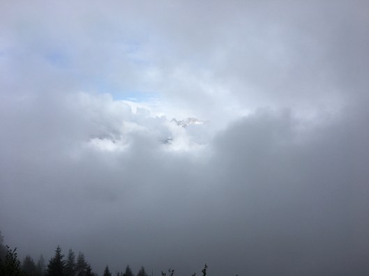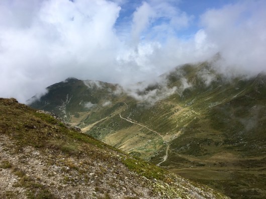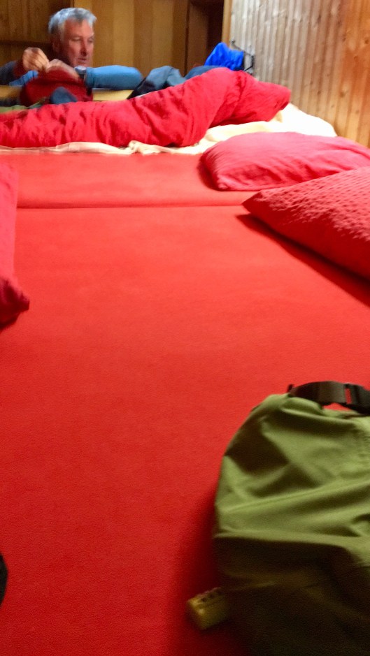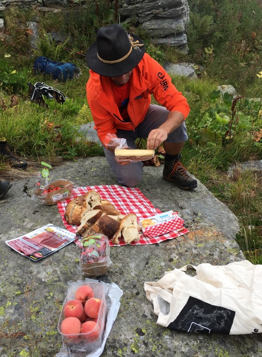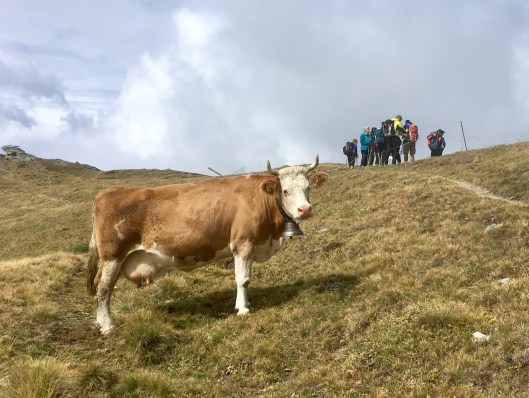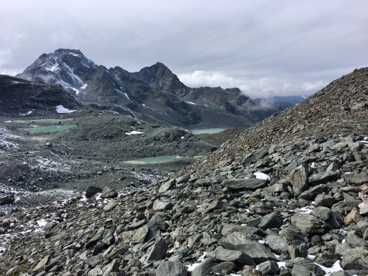 At the top of the hill in the photo above we hit the rock band, as we had done once close to the ridgelines crossed on previous days. We were getting used to this, but today there was a difference. As we crested the hill in the middle distance the ground fell away and there was a basin of rocks. Unaccountably, those at the front couldn’t see any route markers so Clive and I broadly followed another trecker ahead. It turned out to be a very interesting and really rather fun 300m of uphill rock-hopping. We soon overtook the other trecker who ominously said she was glad we knew the route because she didn’t. Ah! We ploughed gamefully on thoroughly enjoying the exercise and the view. This poor photo at least gives you the gist. Pretty Swiss mountains? No. Fun to climb? For Clive and I, yes. Appreciated by Pascal? Er, no. He was somewhat perturbed that we elected to go that way when there was a perfectly good and much safer way-marked route that, had we not been so impetuous, he would have shown us. Ooops!