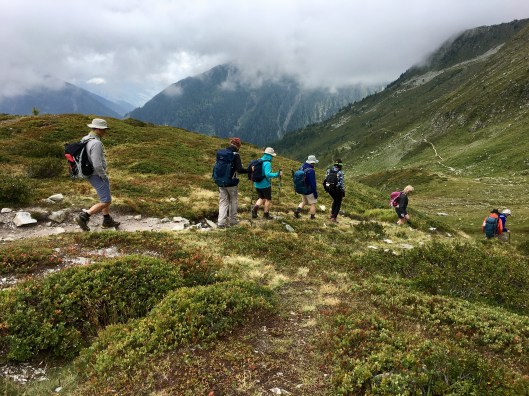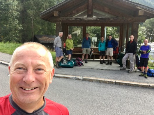 Amazingly we spent quite a good night at the Schwarzhorn but we still left promptly. After an early breakfast our bags were in the minibus and we were walking by 6:30. We needed to be away sharply because while the trip went on to day 10 (Saturday) for everyone else, Bernie and I needed to get home Friday night. Our flights were between 9pm and 10pm from Geneva, a 4-hour train journey from St Niklaus where we would be met by Yves mid-afternoon.