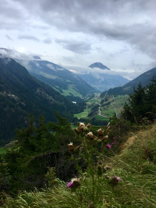 We all survived and at about 11:15 the Matter Valley came into view. Unfortunately the Matterhorn couldn’t be seen from here but the vista lost nothing because of that. St Niklaus was tucked into the valley fold in the bottom left of the photo.