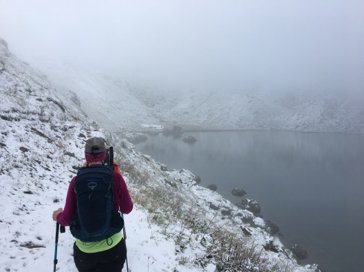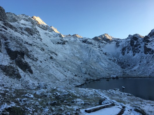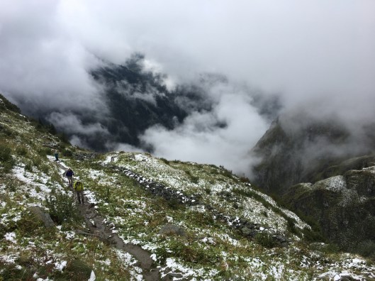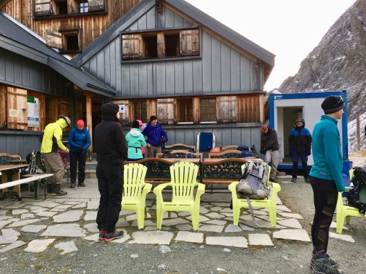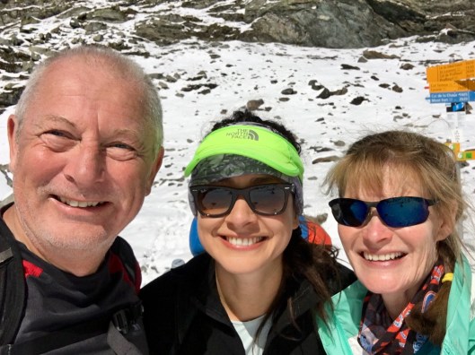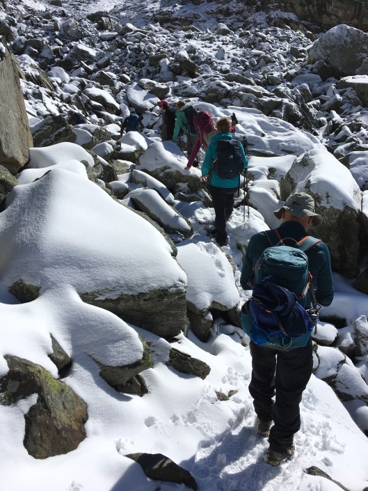 After the break we headed down the eastern side of the ridgeline, crossing a much less forbidding rock band on a clear gritty track, smiling broadly. Extraordinarily, I heard several people agree that this was the best day so far, not despite the early start but because of it. As we weren’t on glaciers or deep snow we hadn’t needed to use the classic 4 or 5am ‘Alpine starts’ to travel before the sun melted the snow and ice. But today’s relatively early (for walkers Haute Route trekkers) start had resulted in a lighter, brighter and cooler first half of the day.