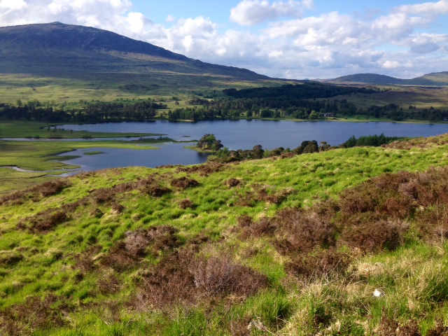 The track was a mixture of stone steps and gravel but the pain was eased by the magnificence of the views opening in front as Loch Leven came into view. Once through the trees the way levelled out a little and heather moorland predominated. While there were trees from time to time, mostly birch, fir or pine, the terrain was mostly open while the quality of the track deteriorated. I could see a black-clad figure some distance ahead and it took hardly any time to catch them as their progress was very slow. It was a little old man whose bald head was burned the colour of copper. As I came level with him he turned to his right to reveal a neatly trimmed white goatee beard and sparkly eyes in a very weather-beaten face. He confided that his feet were more sore than he hoped would be the case, and that he was supposed to have been at work today but had called in sick. I wished him well while hoping he wasn’t due to work Saturday either as he might still be on the trail.