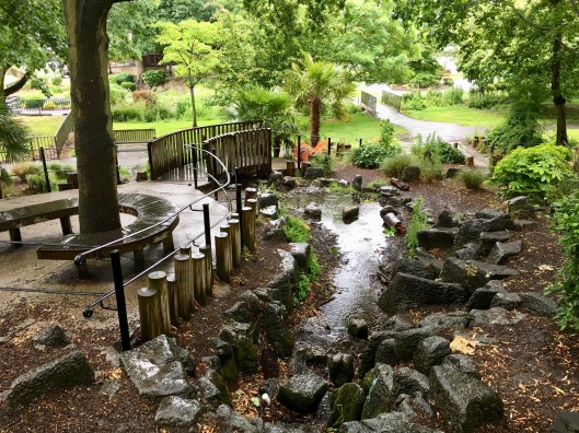 Still containing the River Brent this beautiful urban countryside park has extensive grassed areas and many trees along the riverside. There is a large maze with a raised viewing platform, there are two children’s playgrounds one including a death slide, or zipwire as I am often urged to term it before boosting the grandchildren along it. Every few minutes high-speed Great Western Main Line trains can be heard in the distance as they scream towards Paddington station over the Wharncliffe Viaduct. This viaduct was the first major structure designed by Isambard Kingdom Brunel. Built in 1837 it carries trains across the lower part of Bunny Park at a dizzying hight of 65 feet. But the occasional whoosh doesn’t detract from the pleasure given by this park. This really is the green green grass of home.